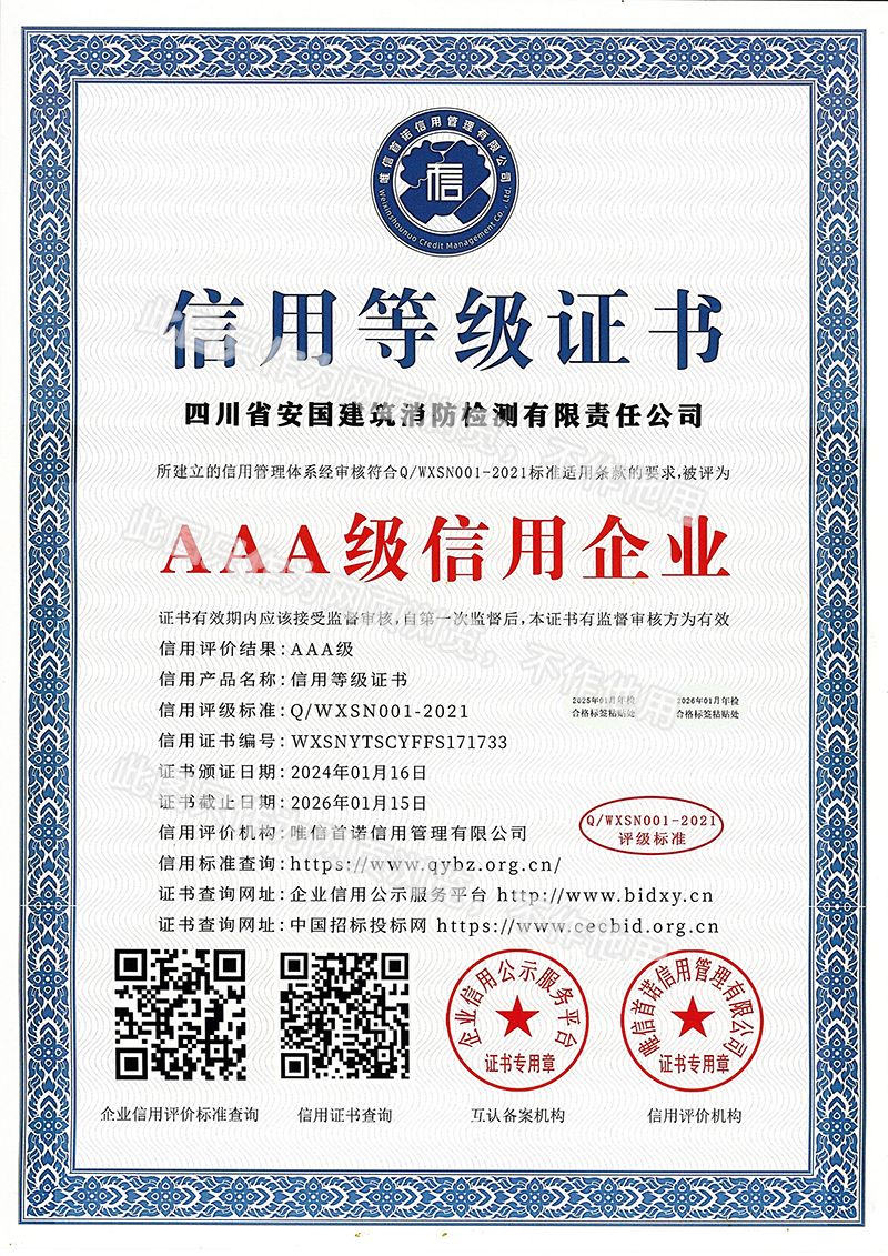 四川省安國建筑消防檢測有限責任公司,成立于1998年,經四川省公安消防總隊批準,工商部門注冊的獨立法人單位。 公司具有建筑消防設施檢測、電氣防火安全檢測、維修、保養及技術咨詢一級資質的中介技術服務機構,獲得CMA計量認證。主要業務范圍是:接受建設單位或有關單位委托,承擔新建、改建、擴建建筑自動消防設施技術檢測、電氣防火安全檢測、以及承接建筑消防設施維護保養,對已交付使用的建設消防設施的運行情況進行運行檢測,開展建筑消防設施的消防安全技術咨詢。公司設辦公室、總工辦、財務部、檢測部、維保部等職能機構,擁有一